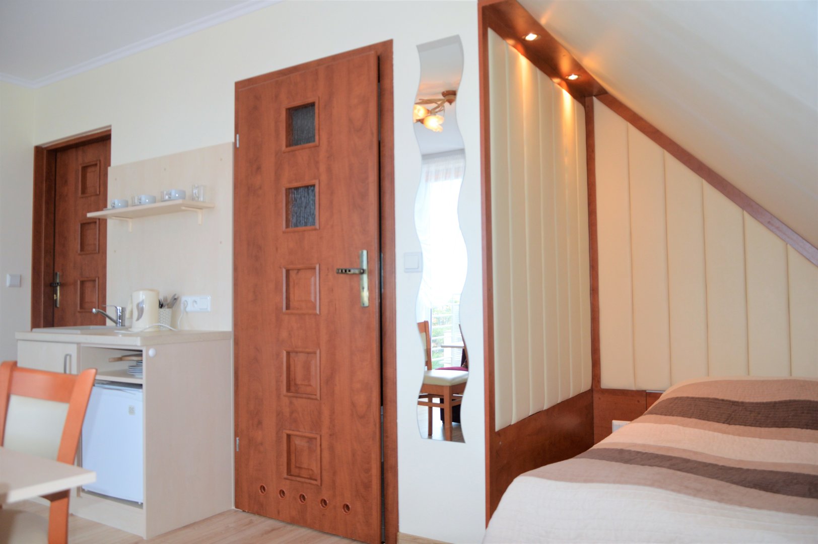 Doskonały pokój na letnie gorące wakacje z uwagi na ekspozycję północną. Jasne, przytulne wnętrze otrzymuje od natury promienie słoneczne od wczesnego świtu. W naprawdę słoneczne dni poszukując odrobiny wytchnienia, znajdziemy je ciesząc swe zmysły niebywałym widokiem w kierunku morza.